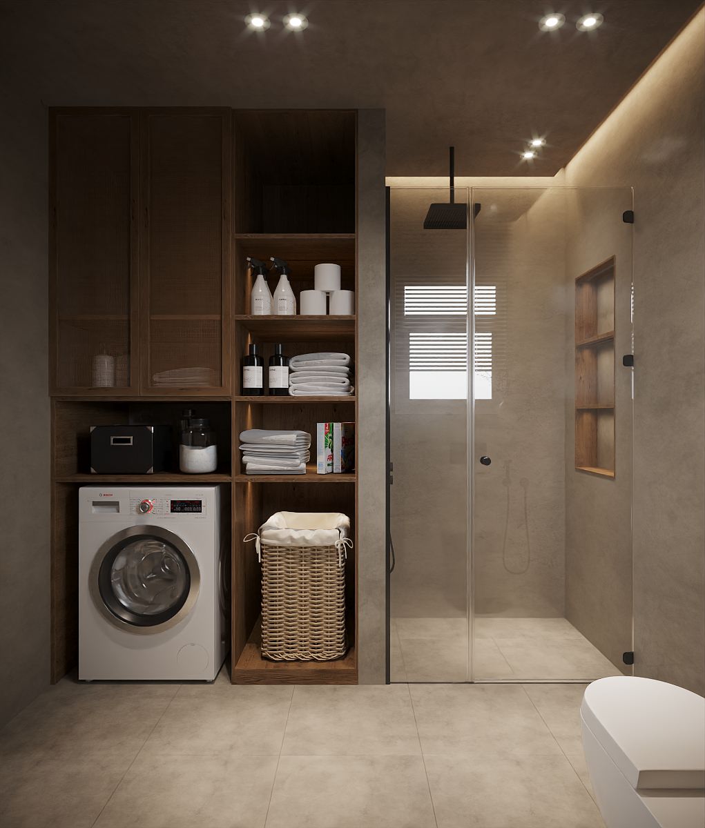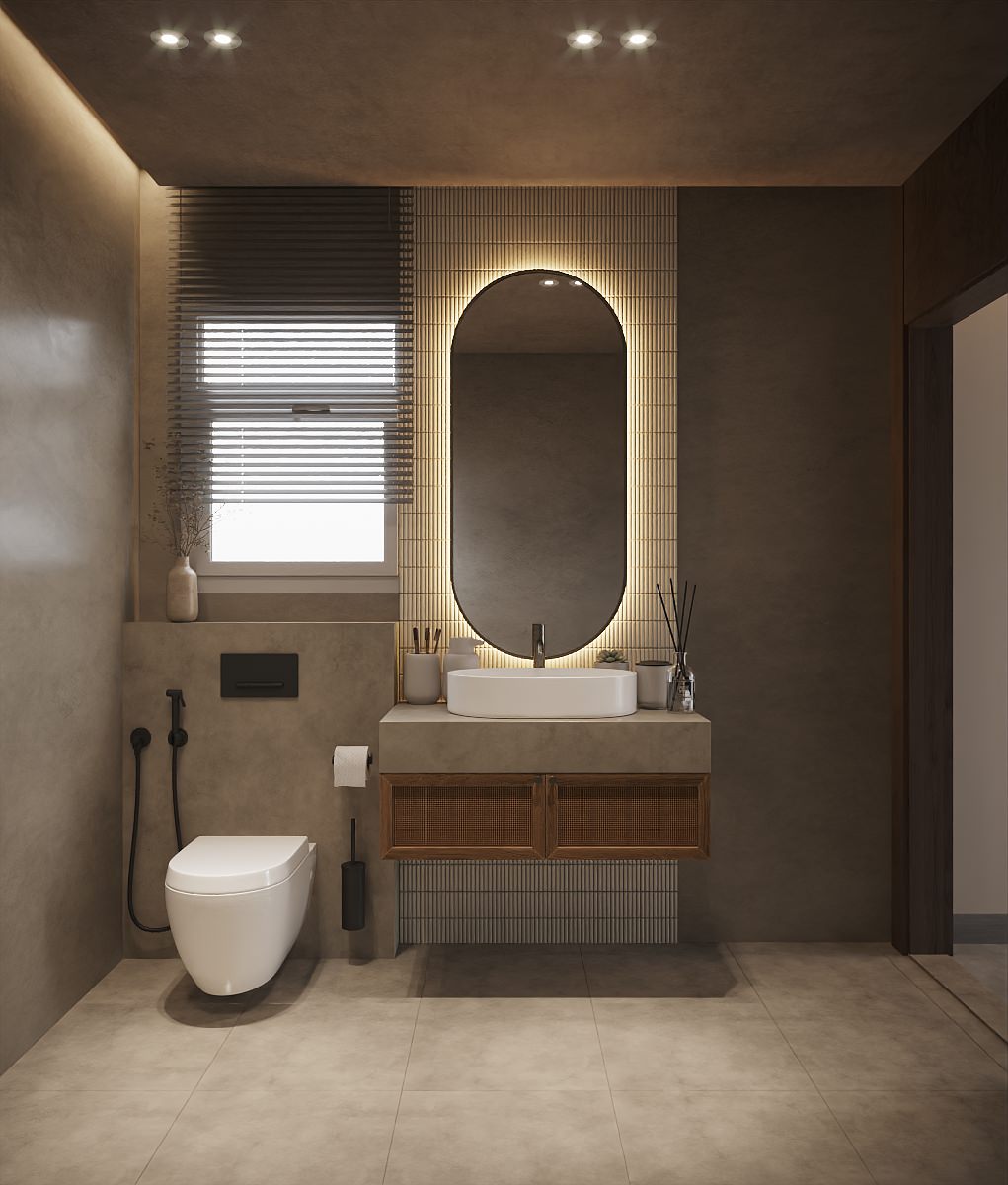 These bathrooms embody the Wabi Sabi philosophy through their serene materiality and understated elegance. Natural textures, muted tones, and carefully chosen imperfection define the spaces. The first bathroom balances minimalism and utility, featuring smooth wooden cabinetry, a floating vanity, and simple matte-black fixtures — all framed by soft, diffused lighting. The second bathroom leans further into organic expression: a hand-carved stone basin, curved irregular mirror, and tactile plaster walls evoke nature’s raw, unrefined beauty. Together, both spaces become more than functional rooms — they are places of quiet ritual, where time slows down, and the imperfect becomes sacred.